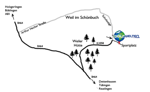 Folgen Sie der B464 in Richtung Böblingen. Biegen Sie scharf rechts auf die K1058 (Beschilderung "Abenteuergolfplatz") ab. Folgen Sie der Straße durch den Wald und biegen Sie nach der Bushaltestelle rechts ab auf die Straße "Im Gaiern". Der Abenteuergolfplatz befindet sich auf der rechten Seite.